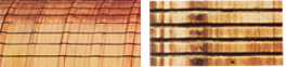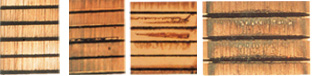 dark marks of varying densities and shape, matt or carbonized, appear in distance of a double pole sharing